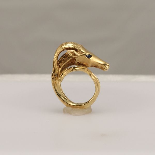 Generously donated by DE BOULLE DIAMOND & JEWELRY: 18K yellow gold gazelle motif ring featuring marquise-cut sapphire eyes. Dallas Safari Club thanks de Boulle Diamond & Jewelry, Inc. for this 100% donation. Josh Garcia, 214-522-2400, Fax 214-522-2480, 6821 Preston Rd., Dallas, TX 75205, jgarcia@deboulle.com, www.deboulle.com. Booth #2238