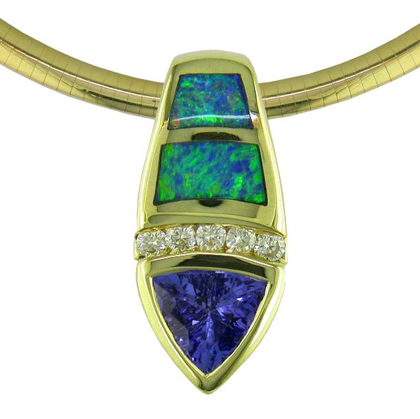 Generously donated by WILDERNESS MINT: This beautiful 14K gold pendant includes a .74ct trillion cut tanzanite gemstone as the center stone accented by inlaid Australian opal and .10ct tw of diamonds. Includes a 16" gold plated omega chain. Dallas Safari Club thanks Wilderness Mint for this 100% donation. Eric Carlson, 360-893-4400, PO Box 1866, Orting, WA 98360, eric@wildernessmint.com. Booth #920