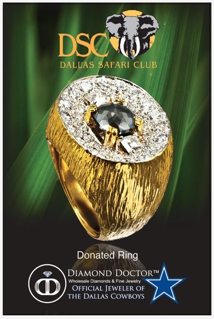 Generously donated by DIAMOND DOCTOR / NITA HUDSON: Beautiful ladies OR gents black diamond ring. Set in 18K yellow gold, the ring contains a 2.50ct cushion-cut black diamond accented by 2.00cts TW of round brilliant white diamonds. The total weight of the ring is 4.50cts. No exchanges or cash value. Dallas Safari Club thanks Diamond Doctor/ Nita Hudson for this 100% donation. Nita Hudson, 8127 Preston Road, Dallas, TX 75225, nitahudson13@gmail.com