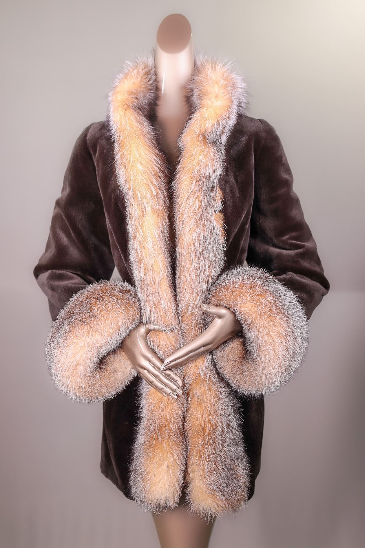 Ladies brown sheared mink stroller with crystal fox tuxedo collar and band cuffs. Reversible to taffeta rainwear. Free sleeve alterations and exchangeable - visit donor at their booth for sizing. For over 70 years, internationally renowned Alaska Fur Gallery of Anchorage has met the fashion needs of discerning men and women. Malena Hausinger, 907-274-3877, 907-223-3678, 428 W 4th Avenue, Anchorage, AK 99501, info@akfurgallery.com, AKFurGallery.Com, BOOTH #2933.