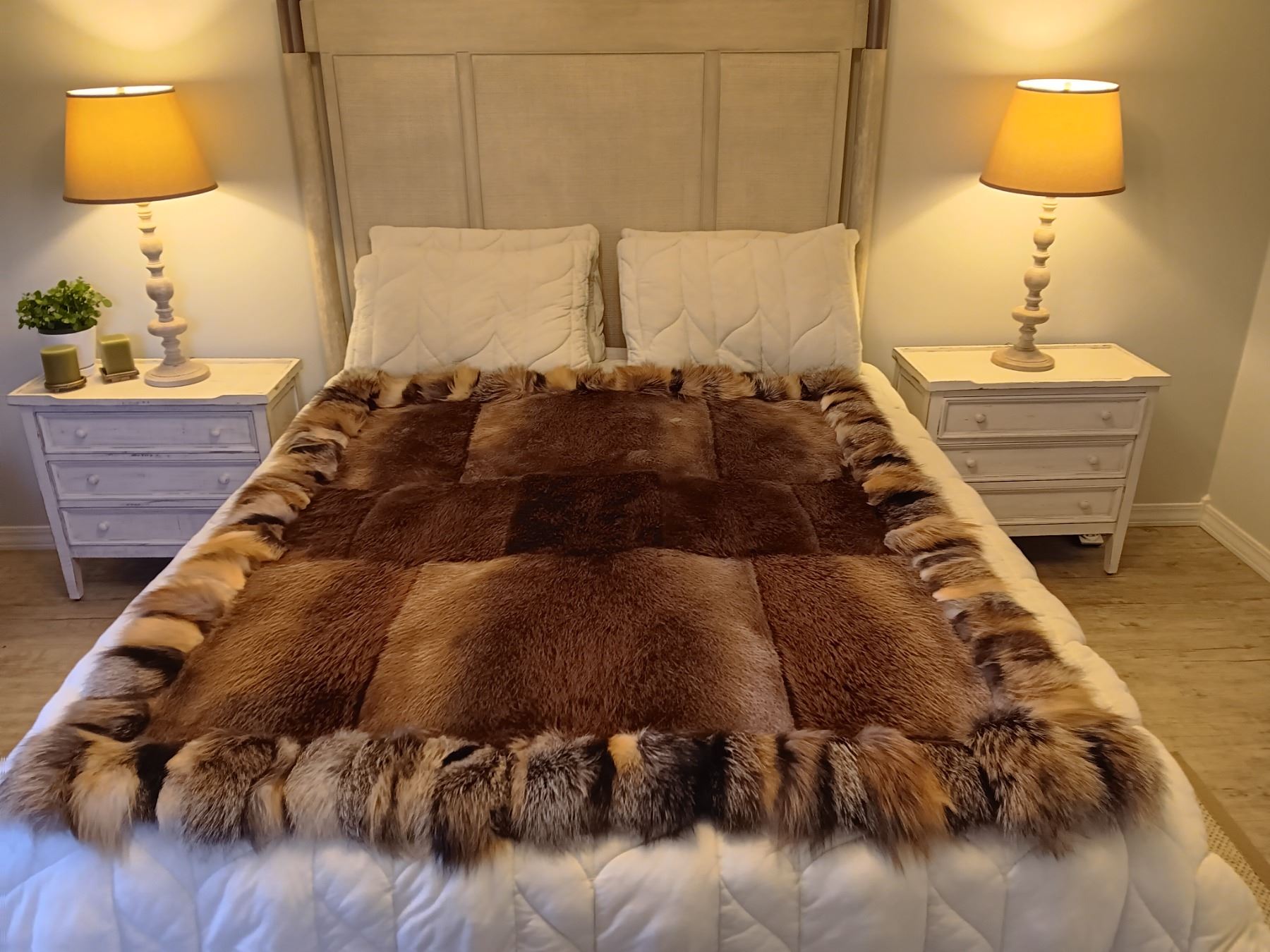 AUX ARC FUR: Luxurious Beaver Fur Blanket with Fox Trim and Velvet Backing and Matching Pillow