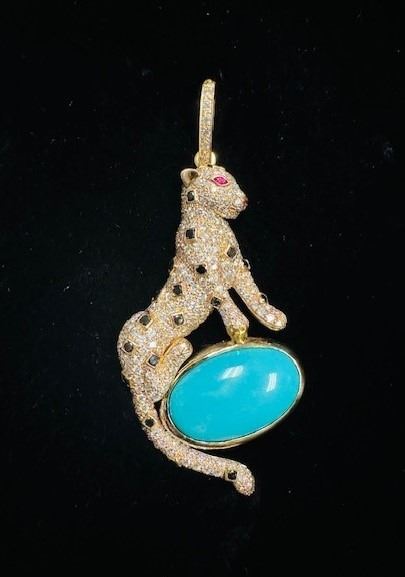 Stunning 14k yellow gold diamond panther with dark sapphires sitting on a Sleeping Beauty turquoise. This iconic panther will captivate everyone and you will receive many compliments. Diamonds are 1.96 cts, dark sapphires are .41 cts, turquoise is 15 cts. Timothy Lee, 770-335-4939, 3044 Old Denton Road, #115-316, Carrollton, TX 75007, tlavanti@gmail.com, AvantiByAvanti.Com, BOOTH #3138.