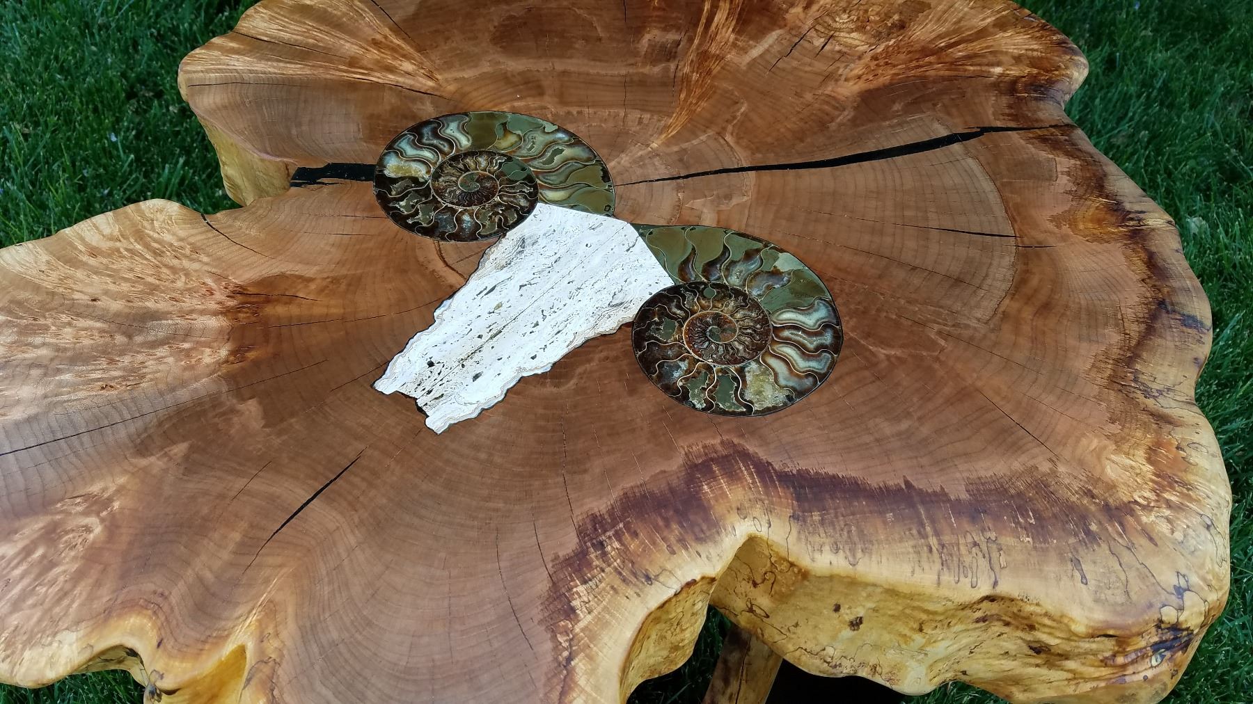 ANDY SANCHEZ - "Ammonite Ram" is a one-of-a-kind piece of furniture art designed by Andy Sanchez and his son, Daniel. This gorgeous end table was handcrafted from spalted maple burl left buried for over 100 years in the Redwood Forest as it was considered "junk wood" during the time the trees were harvested. This stunning piece depicts the face of a mountain sheep designed using white marble with curved horns made using intricately detailed ammonites. Table measures 30" tall and 36"x33" round. Andy and his sons, Aaron and Daniel, have been in business for over 28 years and have sold their artistic furniture all over the United States and Europe. Sanchez is represented by Patrick Mavros' gallery in London, John Banovich's Gallery in Wyoming, Cowboys and Indians of Santa Fe, as well as their own gallery in Algodones, NM, next to their studio. The goal of their family business is to represent God's creations of wood and stone in their natural forms, bringing the outdoors into your home. DALLAS SAFARI CLUB THANKS ANDY SANCHEZ FURNITURE FOR THIS 100% DONATION. Andy Sanchez, 505-385-1189, 505-710-7426, 4 Archibeque Drive, Algodones, NM 87001, andyandaarons@gmail.com, AndySanchez.Com, BOOTH #2523.