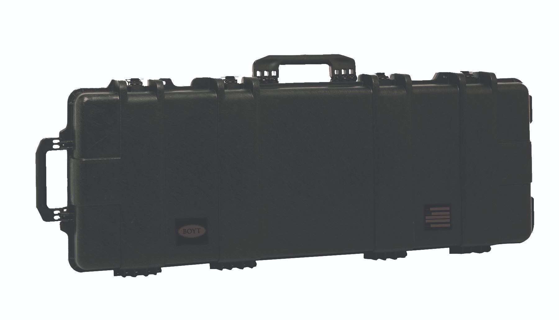 Boyt's H51 double long gun hard case with wheels is constructed of high 120D no-break polypropylene and features a dust-proof O-ring, full-length gasket, steel hinge pins, compact dimensions that meet standard airline requirements, padlock compatible, 4 all-steel, field replaceable, powder coated draw latches, ball bearing wheels, two handles and two foam pieces for a customizable center. Case weighs 24.02 lbs. and measures 51"x15"x6" (interior). Made in the USA; limited life-time warranty. DALLAS SAFARI CLUB THANKS BOYT HARNESS COMPANY FOR THIS 100% DONATION. Judy Kjellsen, 641-342-6773, 641-414-1312, 1 Boyt Dr., Osceola, IA 50213, judy@boytharness.com, BoytHarness.Com, BOOTH #2825.