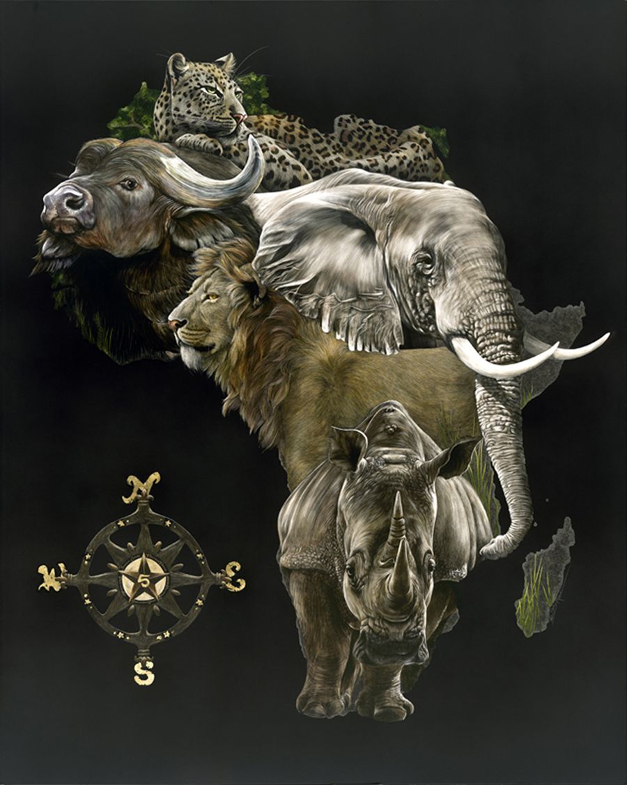 Donated by SALLY MAXWELL: The Big Five game animals form the shape of the African continent. The reproduction is 1/100 printed on canvas and mounted on gatorfoam, elegantly framed and UV protected. It is extremely light and suitable for hanging high on a wall of any trophy room. Measures 48" x 60". Dallas Safari Club thanks Sally Maxwell for this 100% donation. Sally Maxwell, 979-247-4700, 2610 Airport Road, LaGrange, TX 78945, sallychristinemaxwell@gmail.com, www.sallymaxwell.com. BOOTH #2752