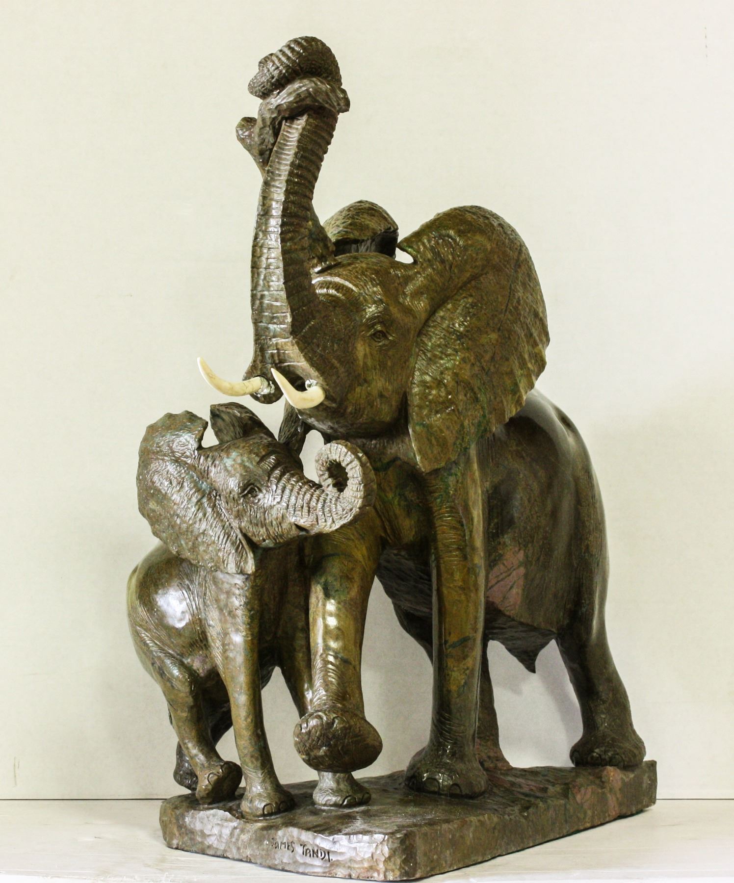 "Elephant & Baby" - Remarkable and rare verdite sculpture by acclaimed Zimbabwean stone sculptor James Tandi, measures 25"x20"x13". This lovely piece depicts the mother and baby embraced with their trunks up, symbolizing the showering of good luck and fortune. Ross Parker, 954-767-8737, 954-445-8252, Fax 954-524-7494, 920 NE 13th Street, Ft. Lauderdale, FL 33304, callofafricawarehouse@yahoo.com, CallOfAfrica.Com, BOOTH #3534.
