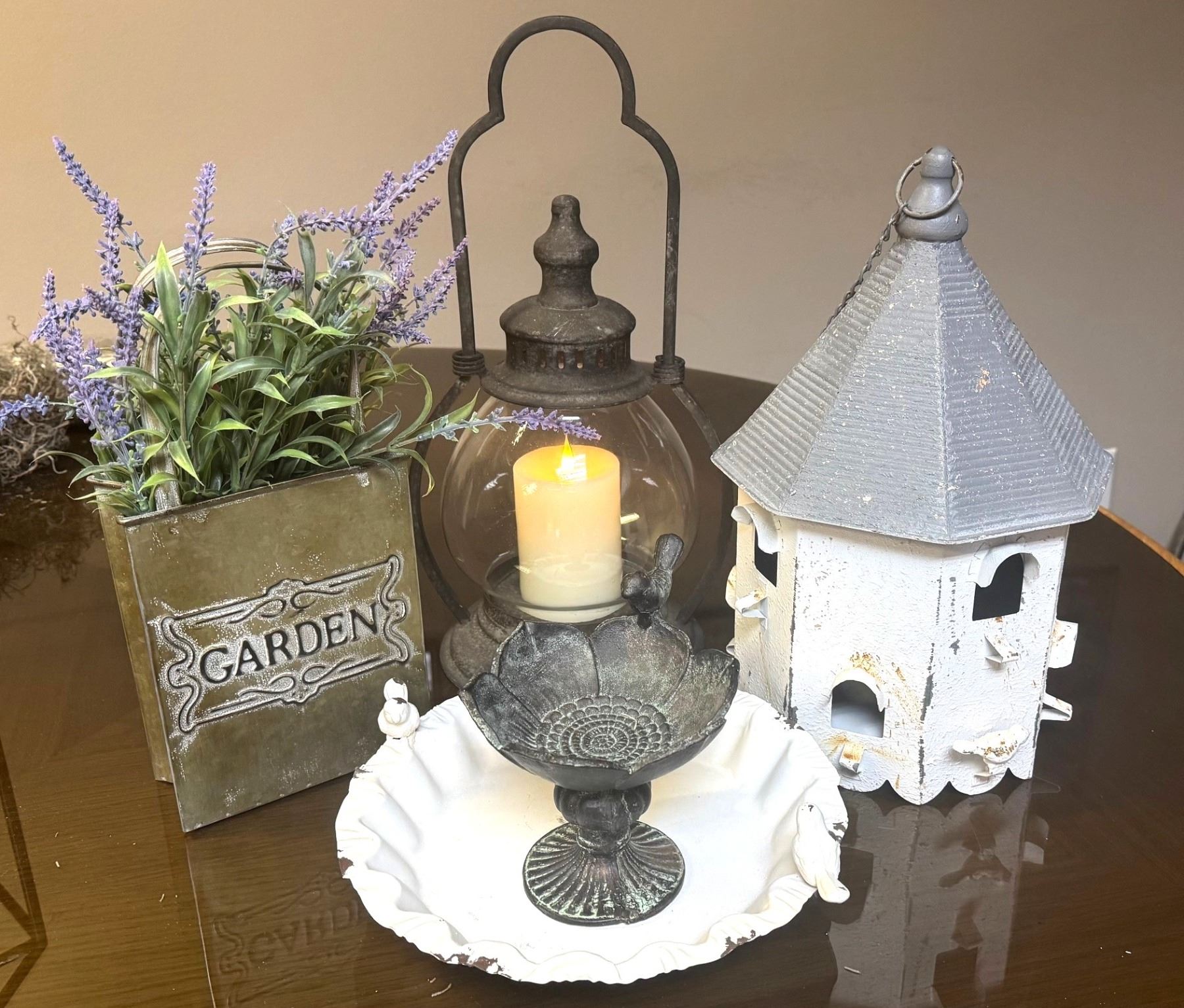 "For The Love of Birds" collection includes a delightful, handcrafted birdhouse and matching birdbath, petite cast iron water feeder, rustic cottage lantern & candle, birdseed and a decorative metal "garden" birdseed bag to keep all the goodies safe from other critters. DALLAS SAFARI CLUB THANKS FRIEND OF DSC FOR THIS 100% DONATION. Christie Selle, christie@biggame.org.