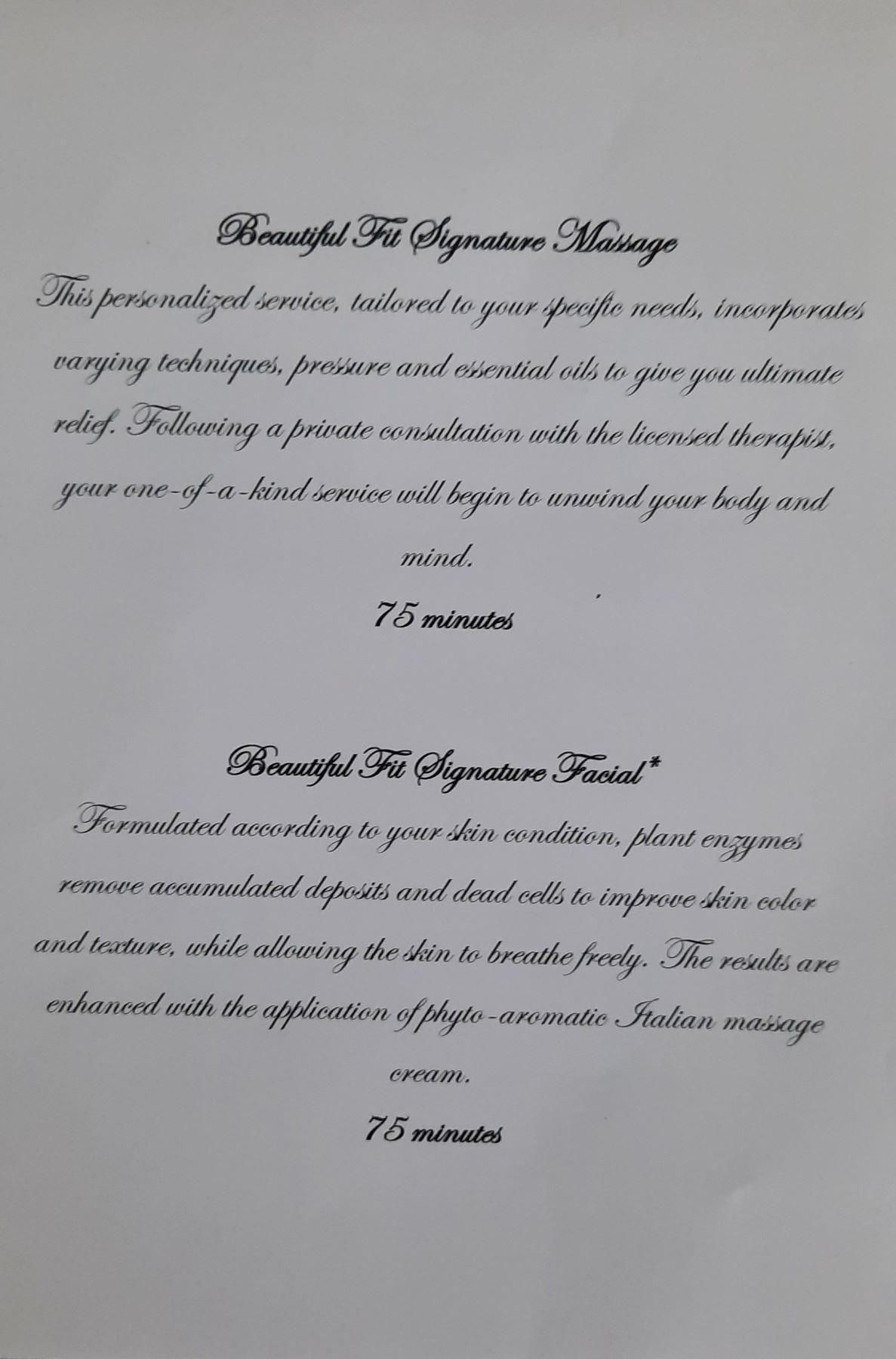 Beautiful Fit Signature facial and personalized massage. FACIAL: Formulated according to your skin, plant enzymes remove accumulated deposits and dead cells to improve skin color and texture, while allowing the skin to breathe freely. The results are enhanced with the application of phyto-aromatic Italian massage cream; 75 minutes. MASSAGE: This personalized service is tailed to your specific needs and incorporates varying techniques, pressure and essential oils to give you ultimate relief. Following a private consultation with the licensed therapist, your one-of-a-kind service will begin to unwind your body and mind; 75 minutes. DALLAS SAFARI CLUB THANKS GLORIA TOSTADO-HANN FOR THIS 100% DONATION. Pickup or shipping: Contact Christie Selle at christie@biggame.org.