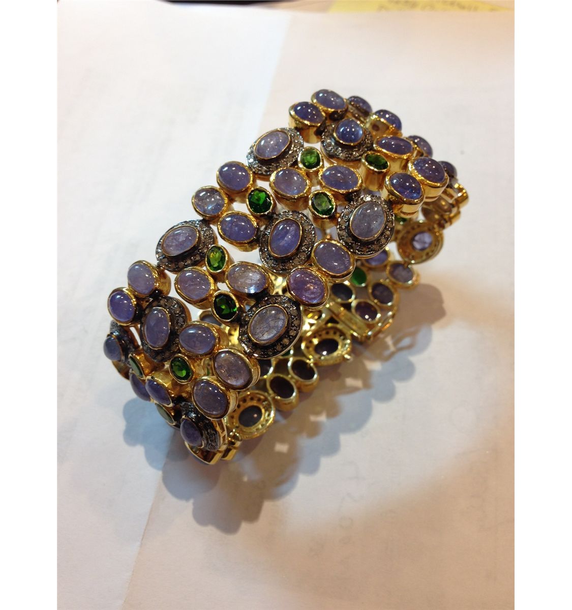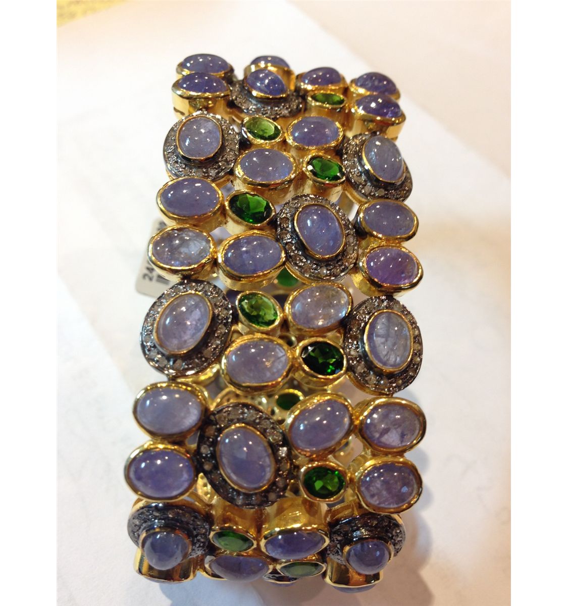 Generously donated by KELLY MITCHELL FINE JEWELRY: Gorgeous gemstone and diamond bracelet adorned with 81.40 carats total weight of cabochon-cut tsavorite and tanzanite gemstones and 2.00 carats total weight of diamonds. Bracelet measures 1.5 inches in width and features a push clasp with double safety locks. Dallas Safari Club thanks Kelly Mitchell Fine Jewelry for this 100% donation. Kelly Mitchell, 214-736-5155, Fax 214-599-8788, 4256 Oak Lawn Avenue, Dallas, TX 75219, kelly@kellydiamond.com, www.kellymitchelljewelry.com. Booth #2723
