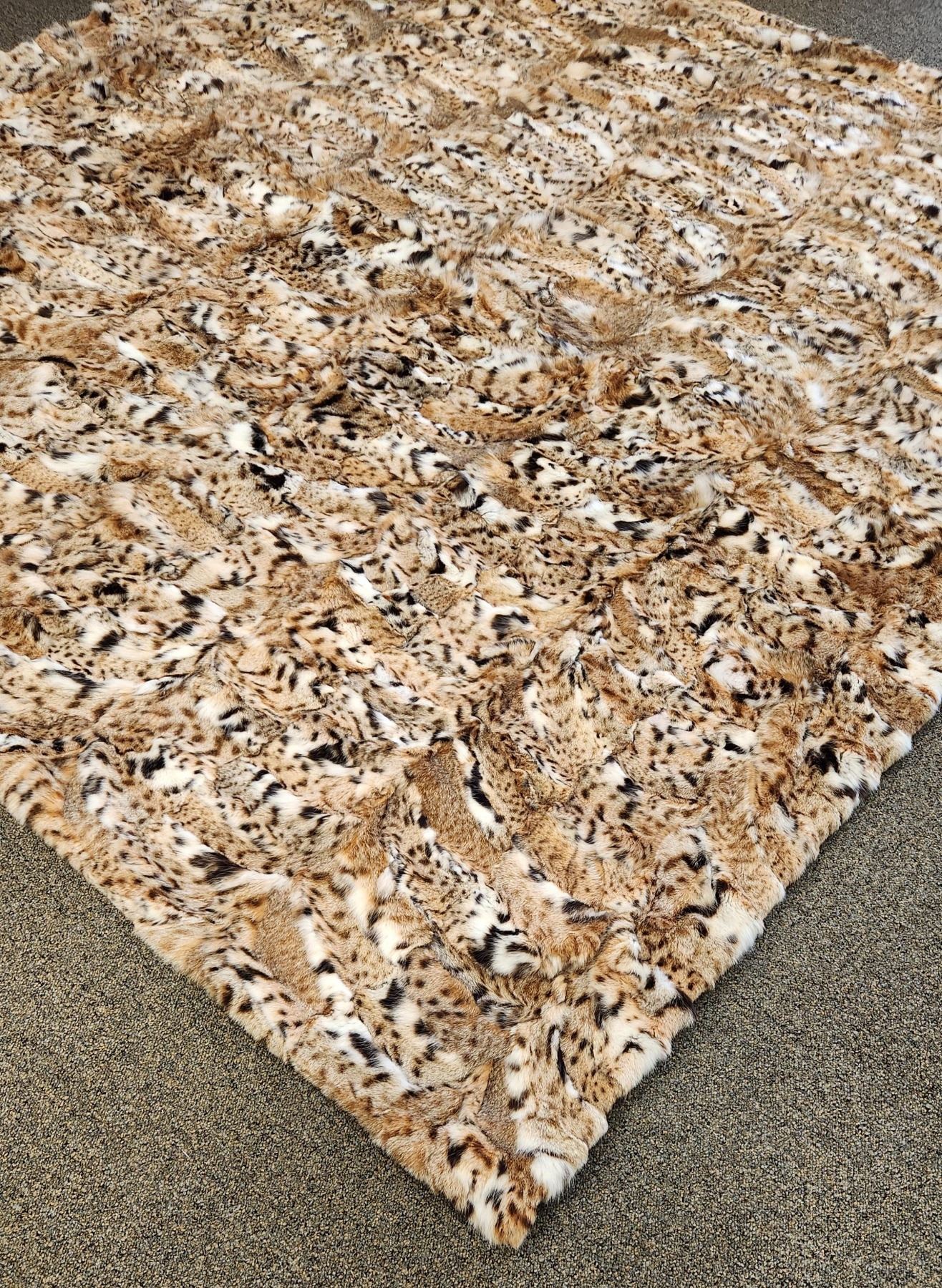 Immerse yourself in the untamed beauty of the wild with this stunning North American lynx blanket, measures 92"x86". Crafted exclusively from select, wild-harvested lynx cat, this luxurious piece showcases the rich, natural spot patterns and textures of the lynx, renowned for its exceptional softness and warmth. This one-of-a-kind blanket is not only a testament to the artistry of traditional craftsmanship but also a celebration of the majestic wilderness. Perfect for adding a touch of wild elegance to any space, this blanket is a true collector's item and a unique addition to any home decor. DALLAS SAFARI CLUB THANKS HYDE FUR & SHEARLING CO. FOR THIS 100% DONATION. Sergio Hernandez, 435-604-0186, 340 Main St., Ste 100, Park City, UT 84060, hydefurandshearling@gmail.com, HydeLuxuryApparel.Com, BOOTH #2230.