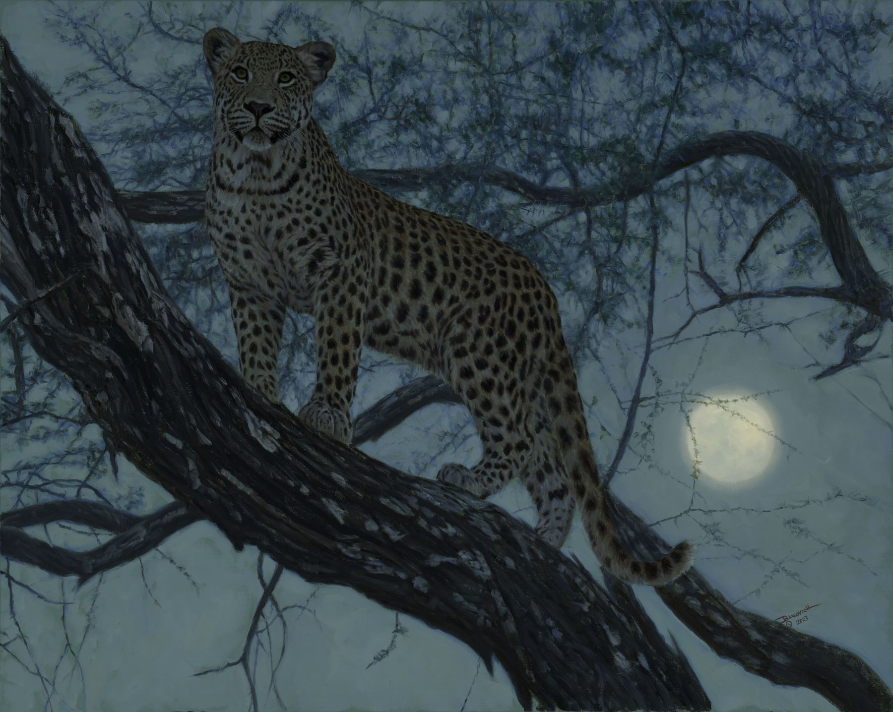 "Leopard Moon" - Original oil on Belgian linen by international wildlife artist John Banovich, measures 24"Hx30"W. "I vividly remember the thrill that rushed through me when I spotted a leopard so gracefully perched on a tree limb. Its commanding presence, adorned with those striking spots and piercing eyes, left me in awe. I observed in silence, mesmerized by the interplay of shadows and highlights created by the moonlight on its sleek fur. The silvery-blue light of the moon created a sense of magic and mystery in the air. The anticipation in the leopard's gaze hinted at its elusive prey, hidden somewhere in the shadows. As an artist, it is my mission to capture not just the physical appearance of wildlife but also their essence and the emotions they evoke. In "Leopard Moon", I sought to convey the elusive nature of this magnificent creature, its independence, and the sense of wonder it brings" - John Banovich. Kimberly Fletcher, 307-200-1622, 2 Pine Creek Rd., Livingston, MT 59047, kimberly@johnbanovich.com, JohnBanovich.Com, BOOTH #2537.