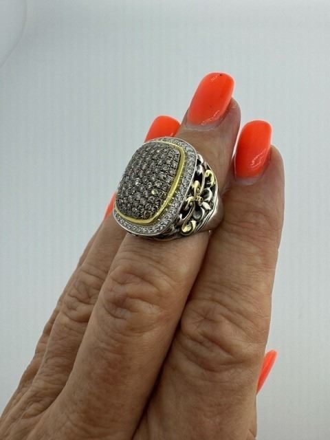 Designer 18k yellow gold and sterling silver diamond ring. The center of the ring features 2.50 carats of cognac colored pave diamonds and is surrounded by 1.00 carats of white pave diamonds in a halo around the center. The ring itself has a fleur-de-lis design on the sides in 18k yellow gold and sterling silver. DALLAS SAFARI CLUB THANKS KELLY MITCHELL FINE JEWELRY FOR THIS 100% DONATION. Kelly Mitchell, 214-736-5155, 972-345-0255, 4256 Oak Lawn Avenue, Dallas, TX 75219, kelly@kellymitchelljewelry.com, KellyMitchellJewelry.Com, BOOTH #2912.