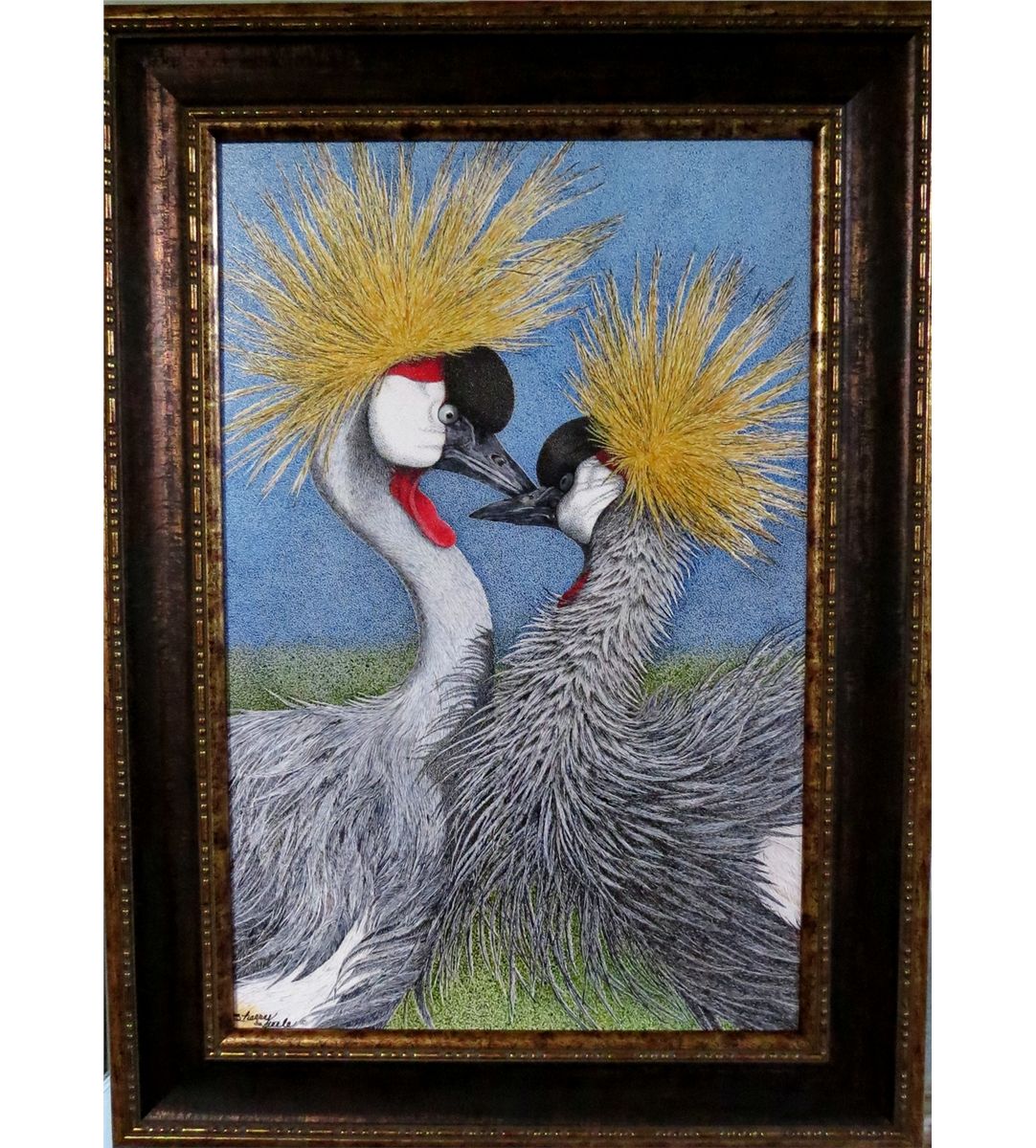 Generously donated by SHERRY STEELE UNLIMITED: “Let Me Call You Sweetheart” - S/N giclee by Sherry Steele. Sunrise caught this pair of grey-crowned cranes as they began their courtship dance atop an acacia tree. Feathers flared, the two life-long mates would touch beaks, dance and come together again in another 'kiss'. The rays from the rising sun turned their golden crowns into spun gold as they consummated their bond. Mixing the inks to capture these indescribably exquisite creatures put the artist's pens to the test as feather after feather was layered in. The vibrant colors embody the passion of Africa, while the delicate fringe of their crowns shows the intricate balance of beauty and brilliance. Both the dance, and the piece it inspired, became a work of love. Number 1 of only 10 in an oversized canvas edition and custom-framed to suit the most elegant décor. Bring the colors of Africa into your heart and home. Overall dimensions: 31”w x 42”h. Dallas Safari Club thanks Sherry Steele Unlimited for this 100% donation. Sherry Steele, 512-892-3553, 5335 Magdelena Drive, Austin, TX 78735, ssteele@texas.net, www.sherrysteele.net. Booth #2715