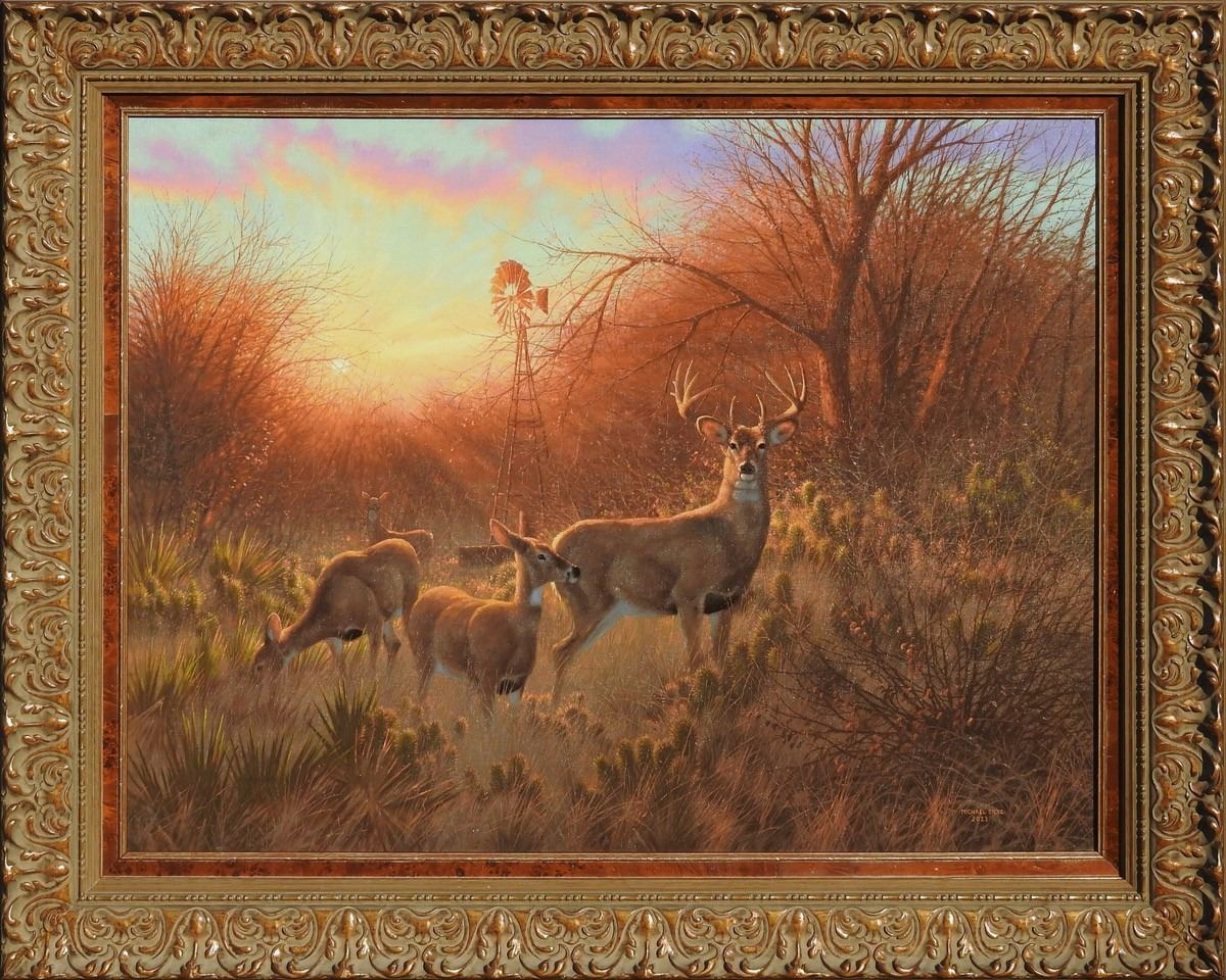 "Texas Gold" - Original framed artwork on canvas by wildlife artist Michael Sieve. An avid sportsman and recognized wildlife and big game artist, Sieve believes that the best wildlife art, prints and posters are inspired by actual experiences in the field. "As a professional artist, I have painted a lot of whitetail deer over the last 40 some years. Almost all of them are from my backyard here in Minnesota. But in 1979, I painted a deer based on research in the Hill Country of west Texas. This painting is the first Texas whitetail deer that I have painted since then. In this painting, I wanted to capture the heat and the dryness of the land, I wanted to show the brushy country and the cactus that thrive there. The lighting was a real challenge, and I spent a lot of time working on that and trying to get it right. I think I did, and I hope you agree. Congratulations on your success in supporting hunting and conservation." Michael Sieve, 507-421-2527, michaelsieveart@gmail.com, BOOTH #3347.