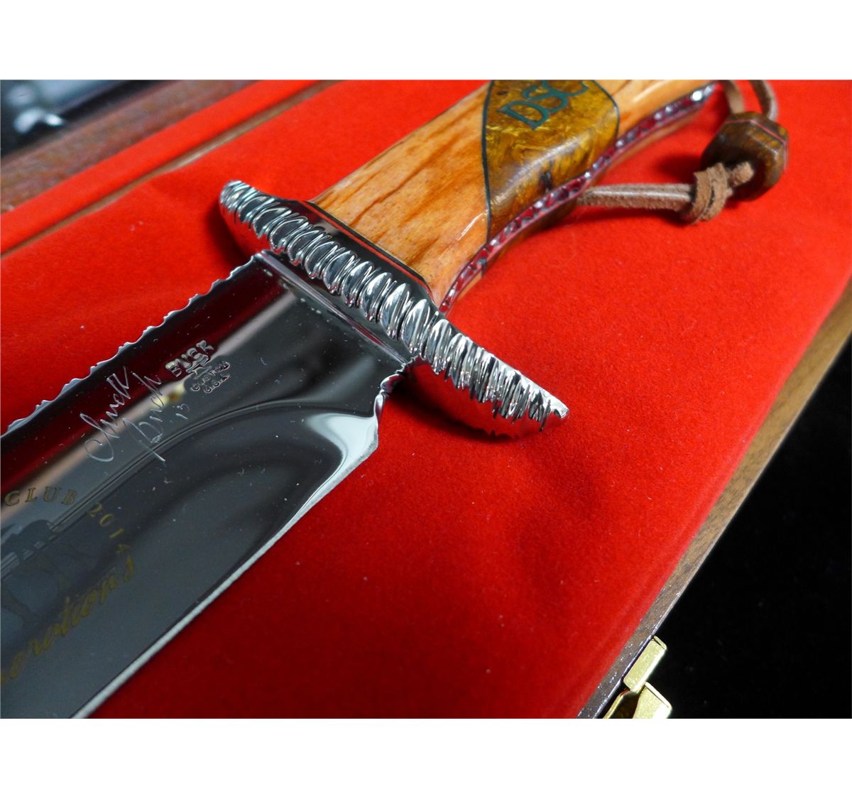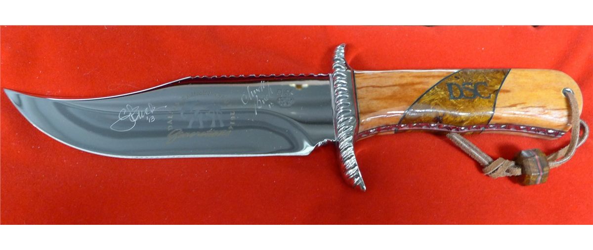 Donated by BUCK KNIVES: Model 905 Mountain Man bowie knife. 420HC mirror polished, custom file work blade with the 2014 DSC Generations logo acid etched and 24K gold plating signed by Chuck and CJ Buck. Nickel silver guard with custom file work. Giraffe bone handle and desert iron wood with DSC inlayed in nickel silver. 1 of 1. Letter of authenticity and glass display case are included. Dallas Safari Club thanks Buck Knives for this 100% donation. Billy Bates, 208-262-0500, 208-262-0482, 660 S. Lochsa Street, Post Falls, ID, billyb@buckknives.com, www.buckknives.com. BOOTH #4320