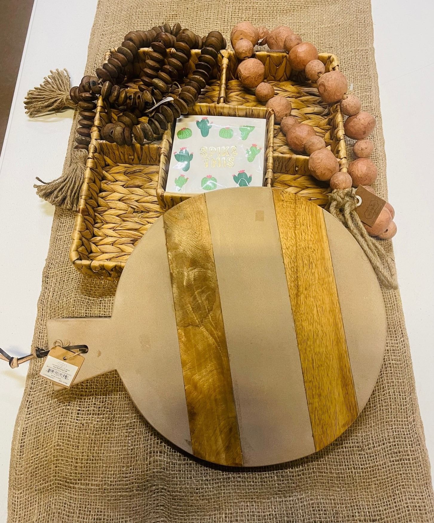 Woven hyacinth tray/napkin set, round sandstone wood board and pair of decorative TerraCotta beads are the perfect hosting pieces for every season. Tray comes with one center holder (napkins included!) and four corner compartments in which to serve drinks. The round sandstone paddle board includes strips of mango wood making for an attractive perfect landscape for serving cheese, fruit and other charcuterie. Drape the decorative TerraCotta beads on the coffee table, shelf or around the centerpiece for a truly warm and inviting atmosphere. DALLAS SAFARI CLUB THANKS ONE COAST FOR THIS 100% DONATION. Janet Meyer.