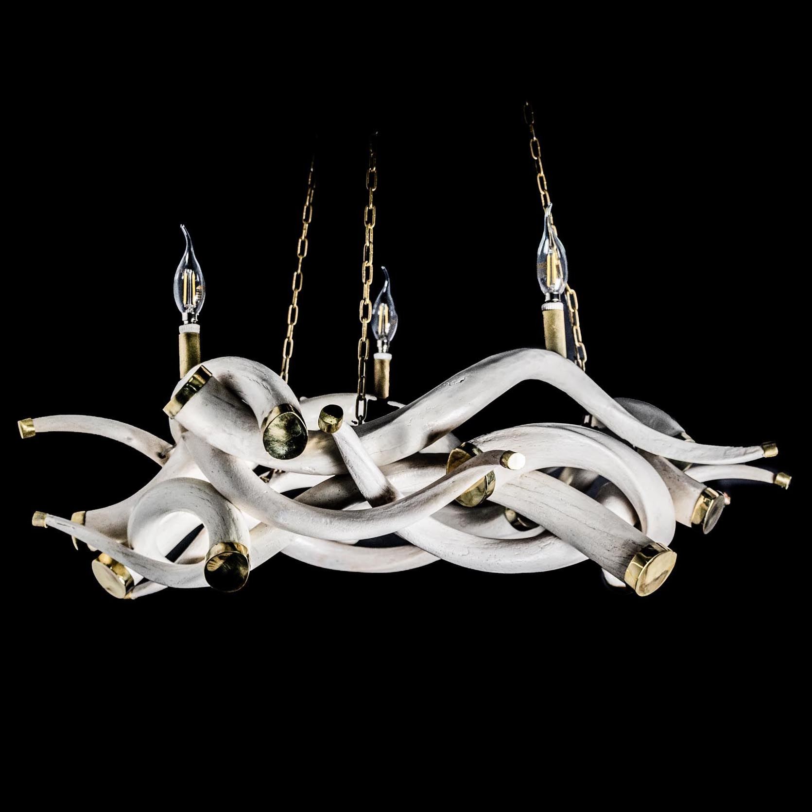 "Crown of Thorns" chandelier made of bleached inner bone curl of kudu horns; measures 4' diameter. Custom made for your home when only the BEST will do! Individually handcrafted by a professional antler artisan from naturally shed horns. Long lasting beauty and quality. U.L. & ETL Certified - U.S. & Canada. Built to last, fully tested, hang level, screwed together and every hole is carefully filled and blended in to match the antler making them virtually undetectable. A true work of art with the utmost attention to detail is what sets this chandelier apart from any others. DALLAS SAFARI CLUB THANKS RANN SAFARIS FOR THIS 100% DONATION. Peter Kennedy, 011 27 31 701 2777, 011 27 82 770 2858, 8 Mason St., Pinetown, Kwazulu Natal 3610, SOUTH AFRICA, peter@napierafrica.com, NapierAfrica.Com, BOOTH #2925.