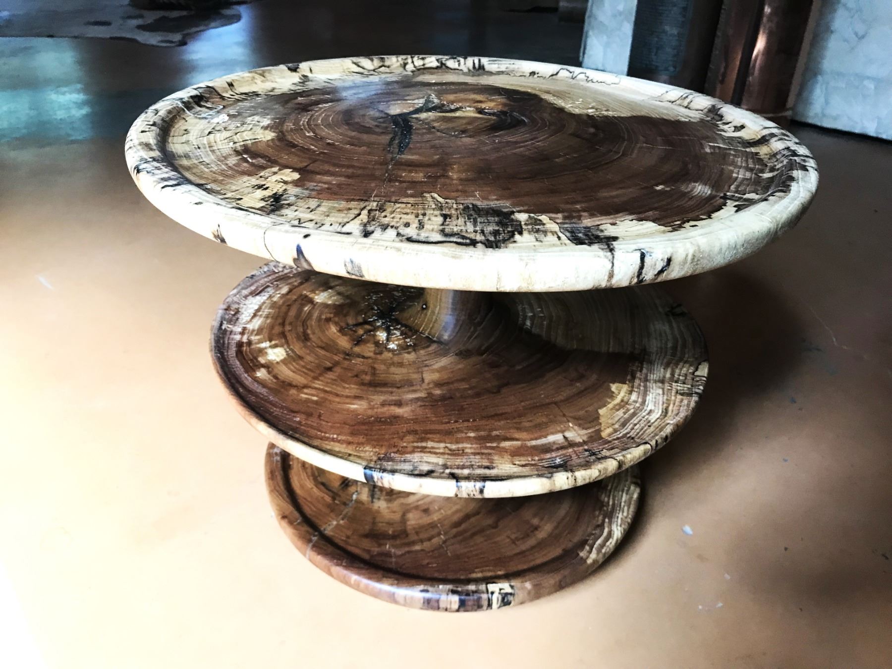 Handcrafted 3-tier wood serving stand custom turned by Jim Rose, USAF Retired. This gorgeous server was crafted from one solid piece of Texas pecan. DALLAS SAFARI CLUB THANKS RUSSELL & MARY EDITH STACY FOR THIS 100% DONATION. Russell & Mary Edith Stacy, maryedithstacy@icloud.com.