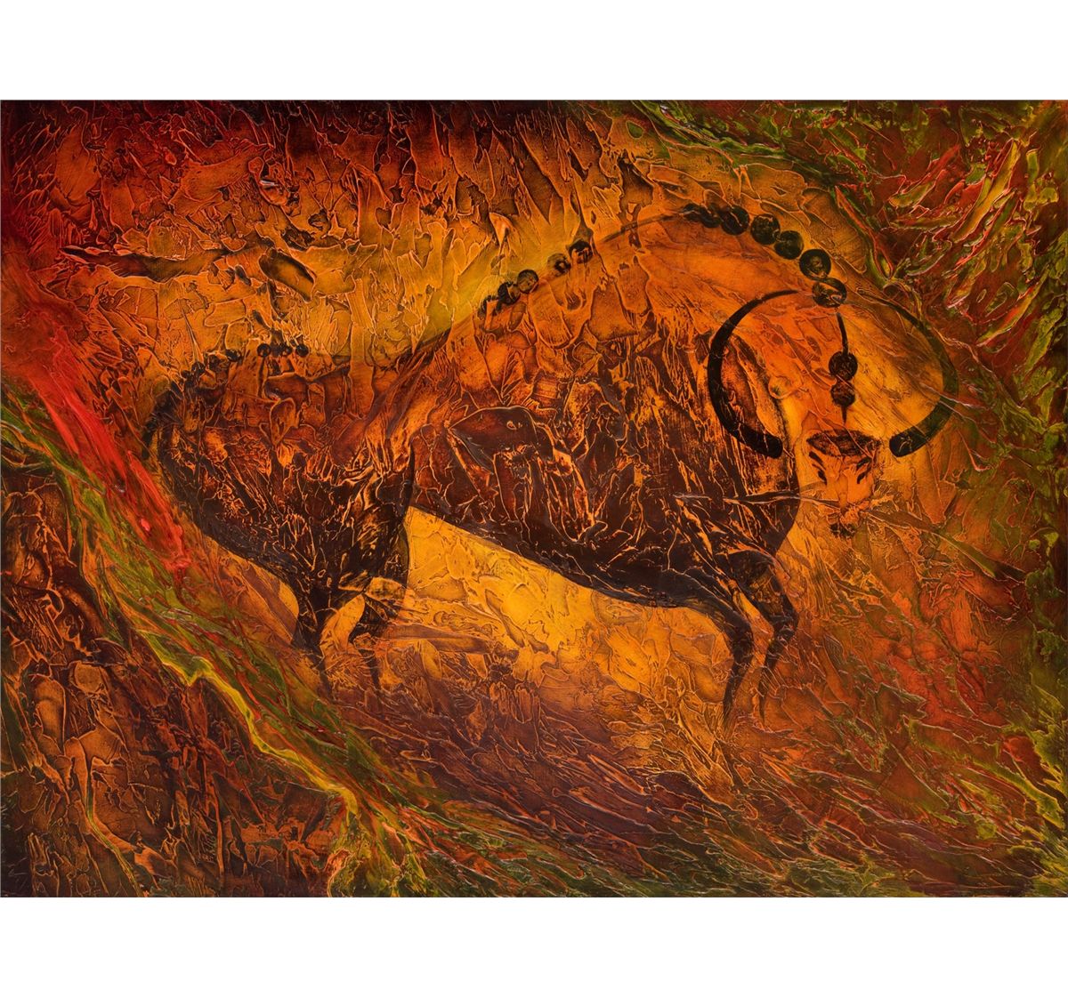 Generously donated by LAUREL BARBIERI STUDIOS: The beauty and mystery of ancient cave paintings is captured in acrylic and gesso on masonite in "Red River Bull", an original relief sculpture donated by international artist Laurel Barbieri. The relief sculpture process that the artist originated and used to create this piece, results in a powerful multi-dimensional work that pulsates with color and depth. This painting reflects Barbieri's close connection to the land, a result of her childhood years growing up in simple circumstances in the rugged Olympic Mountains of western Washington State. This affinity was further developed by her hunting and exploring adventures as an adult. Barbieri's art is filled with organic shapes, heavy textures, brilliant colors, movement and emotion. Each relief-sculptured painting is unique; you will never find another art work like "Red River Bull". This beautifully framed piece measures 53" x 41". Dallas Safari Club thanks Laurel Barbieri Studios for this 100% donation. Laurel Barbieri, 503-369-7557, 7501 SE 152nd Ave., Portland, OR 97236, laurelbarbieri@gmail.com, www.laurelbarbieri.com. Booth #1726
