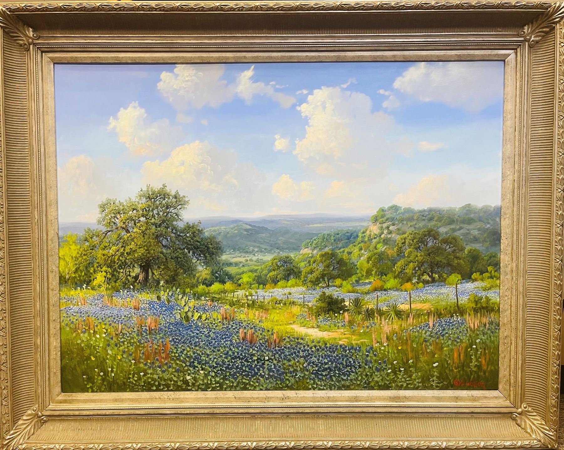 "Blue Vista" - Original oil painting by Texas landscape artist Kay Walton, measures 30"x40" framed (in antique silver wood). Walton is a full-time artist known for her paintings of Texas landscapes, especially the beautiful Hill Country dotted with bluebonnets, oak trees, sparkling streams, winding roads and quaint farmhouses. DALLAS SAFARI CLUB THANKS SOUTHWEST GALLERY FOR THIS 100% DONATION. Mike Downs, 972-960-8935, 214-704-0214, Fax 972-960-9795, 4500 Sigma Rd., Dallas, TX 75244, mike@swgallery.com, SWGallery.Com, Booth #3614.