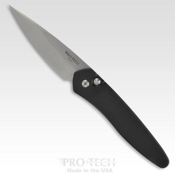 Pro-Tech 3405 Newport knife with smooth black handle featuring a stonewash S35VN blade. DALLAS SAFARI CLUB THANKS SWITCHBLADE USA FOR THIS 100% DONATION. Dedde Barber, 806-224-4367, 409 Harrison Avenue, Port Orchard, WA 98366, switchbladeusa@yahoo.com, SwitchbladeUSA.Com, BOOTH #4505.