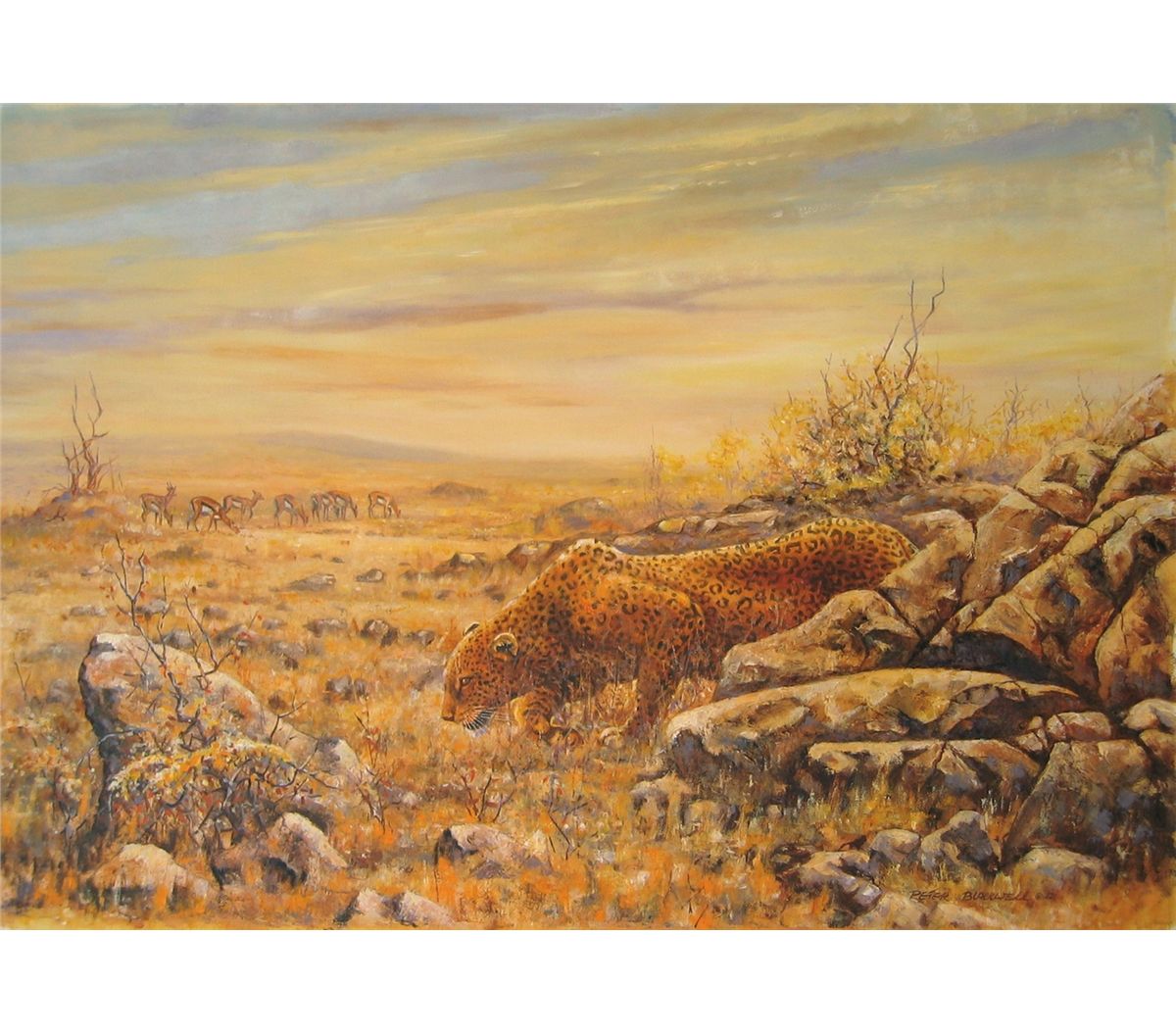 Donated by BLACKWELL WILDLIFE ART GALLERY: "Stalker" original oil on canvas by Peter Blackwell, 24" x 36". Not only do we at Blackwell Wildlife Art Gallery love the experience of the African bush, but our livelihood, and that of many, many people are intricately meshed with, and dependent on, the survival of our natural habitats and the wild animals that have existed on Africa's plains since time immemorial. Therefore, the Blackwell Wildlife Art Gallery has designated 50% of the proceeds from the sale of this painting to directly benefit the Big Life Foundation for anti-poaching projects. Peter Blackwell, 512-909-8230, PO Box 315 Village Market Nairobi, 00621 Kenya, info@peterblackwellwildlifeartist.com, www.peterblackwellwildlifeartist.com. BOOTH #2655