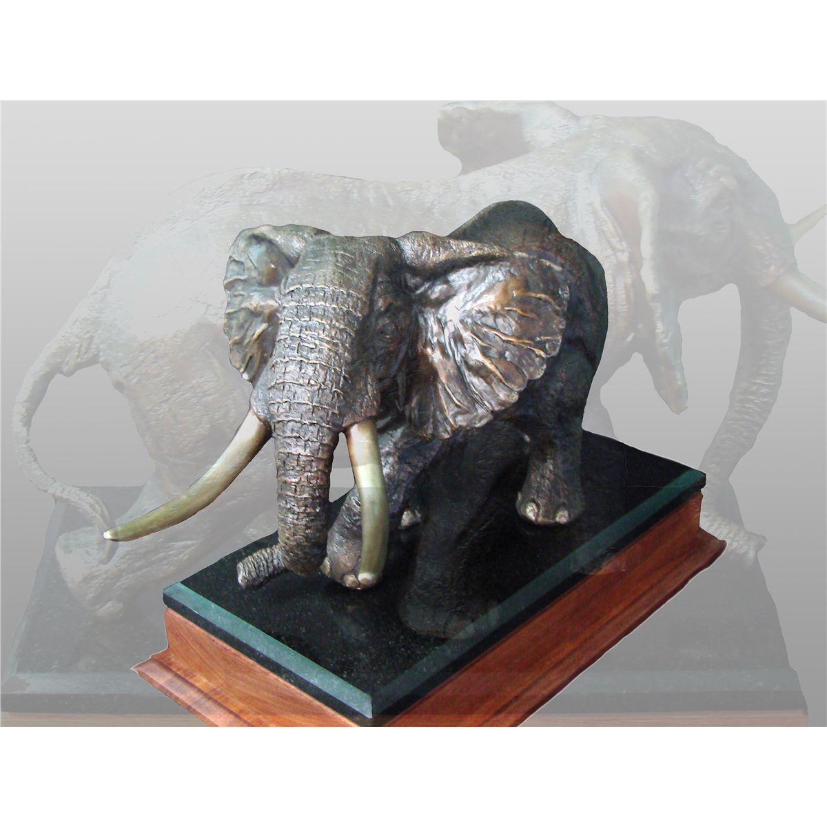 Donated by WILD ARTS BY RAJ S PAUL: "TEMBO HATARI" - #8 of a very limited edition of 45. Long time DSC member, exhibitor, supporter & creator of the PETER CAPSTICK AWARD, Raj Paul has once again donated a magnificent bronze for the cause of conservation. This charging elephant somewhat mimics the DSC logo, stands 15" tall and 18" wide. What makes this a very unique work of art is the texture of the animal's skin - it was created using actual elephant skin, making it as real as the beast itself. Mounted on a magnificent African Babinga wood and Granite base with a built-in turn-table, this bronze will make a brilliant addition to any home or trophy room. Raj S. Paul, 713-252-0763, 8911 Carousel Lane, Houston, TX 77080, rajspaul@sbcglobal.net, www.wildartsbyrajspaul.com. BOOTH #2919.