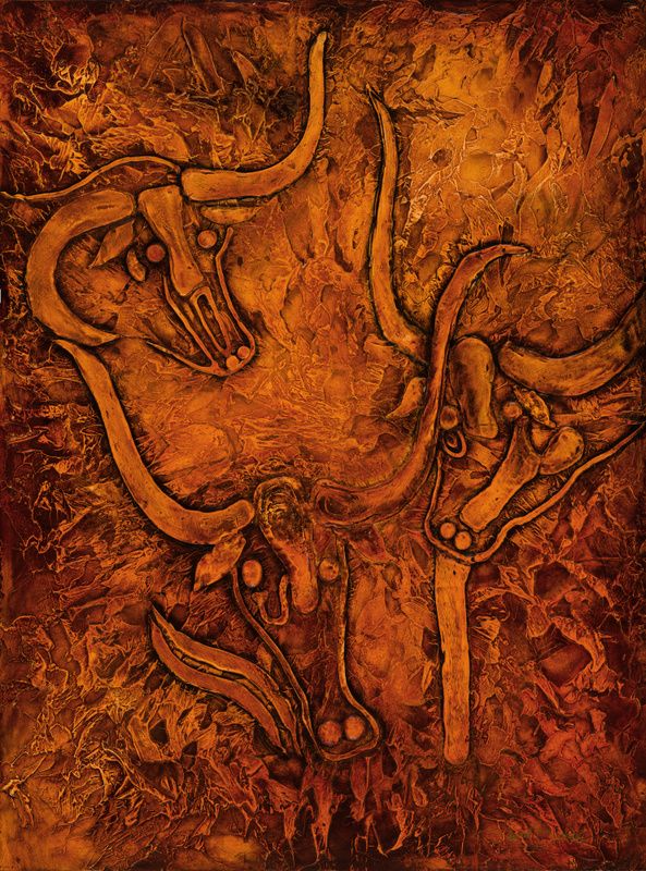"The Cows That Cry" - Original acrylic painting by LAUREL BARBIERI, measures 36" x 48". This inspired replication of an ancient engraving depicts a group of wild cattle, twice as tall as modern day cattle, moving toward a watering hole. The Neolithic engraving on the side of a sandstone outcropping in Tassili-n-Ajjer in southern Algeria works with the surface of the rock to create the illusion of depth and motion. Although wild, the cattle are said to be crying for their human helper. This deep connection between the wild and the human is reflected in Laurel's life and work, as she draws on her experiences growing up as the 8th child of 13 in a rustic three-bedroom house in the forested foothills of Olympic National Park in northwest Washington State. The artist reflects, "It was the early 70's, but we were still using an outhouse. The forest was the source of food and warmth, as well as my private sanctuary." As an adult, Laurel turned to painting to capture the organic shapes, colors, and textures she came to love during those formative years. Images from ancient cave drawings and rock carvings such as those in Algeria are recurring motifs in her work. The Relief Sculpture technique she originated is uniquely suited to convey the intensity of emotion and the texture of the carvings in Neolithic treasures such as "The Cows That Cry". The strong textures and rich colors that Laurel uses in her interpretation of these images conveys her deeply held conviction that when ancient man created these drawings he did not know what great gifts he was leaving us. Per the artist, "To me, these images are the most remarkable and exquisite works of art on earth. Through art works such as this, I hope to share these treasures and awaken the primitive thread that runs deep within each of us." Dallas Safari Club thanks Laurel Barbieri for this 100% donation. Laurel Barbieri, 503-369-7557, 7501 SE 152nd Ave, Portland, OR 97236, laurelbarbieri@gmail.com, www.laurelbarbieri.com. BOOTH #435
