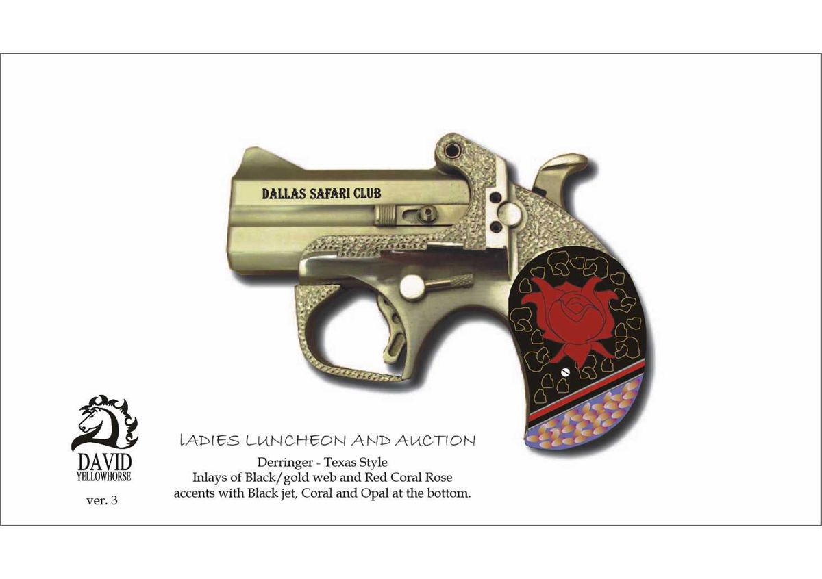 Generously donated by HERITAGE COLLECTABLES, INC: 'The Rose' by Yellowhorse - Heritage Collectables, Inc. presents this one-of-a-kind Bond Arms Texas Defender, designed and handcrafted by award winning artist David Yellowhorse. The artist starts with the Texas Defender and transforms it into a piece of original Navajo artwork. The centerpiece is a rose hand-cut from coral, inset in black/gold web turquoise and accented with black jet, coral and opal. The frame features Yellowhorse's unique texture treatment, while the barrel is acid etched with Dallas Safari Club. The barrel also carries our HC logo, artist's signature and number 1/1. 'The Rose' comes presented in a walnut/glass showcase with black jet-tipped bullets and authenticity plaque. Pistol shoots both .45 Colt or .410 shotgun shells. Dallas Safari Club thanks Heritage Collectables, Inc. for this 100% donation. John Etten, 775-825-4817, 1675 Lakeside Dr., Suite 102, Reno, NV 89509, jetten@hcknives.com, www.heritagecollectibles.com. Booth #3252